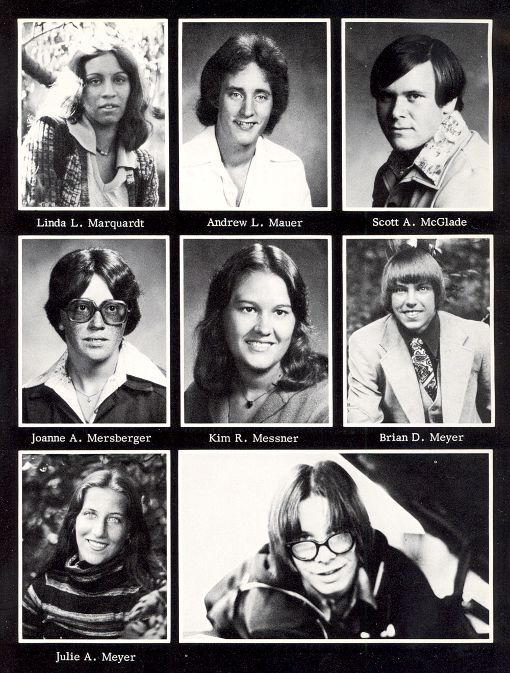 1978 Sheboygan Falls High School, Page 127: Linda L. Marquardt, Andrew L. Mauer, Scott A. McGlade, Joanne A. Mersberger, Kim R. Messner, Birna D. Meyer, Julie A. Meyer.