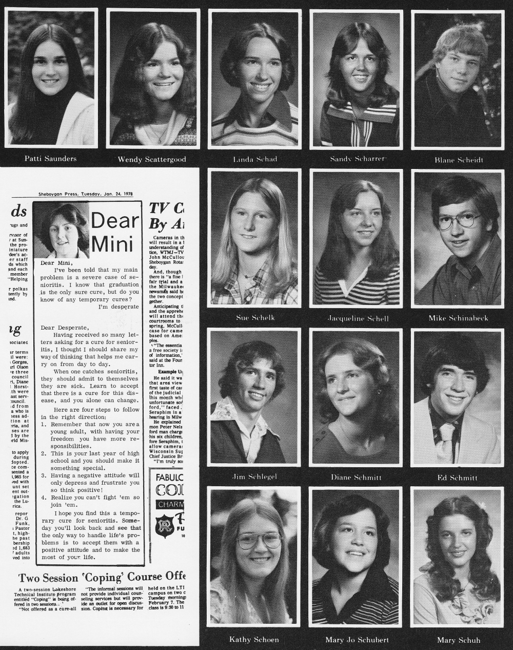 High School, Page 111: Patti Saunders, Wendy Scattergood, Linda Schad, Sandy Scharrer, Blane Scheidt, Sue Schelk, Jacqueline Schell, Mike Schinabeck, Jim Schlegel, Diane Schmitt, Ed Schmitt, Kathy Schoen, Mary Jo Schubert, Mary Schuh.
