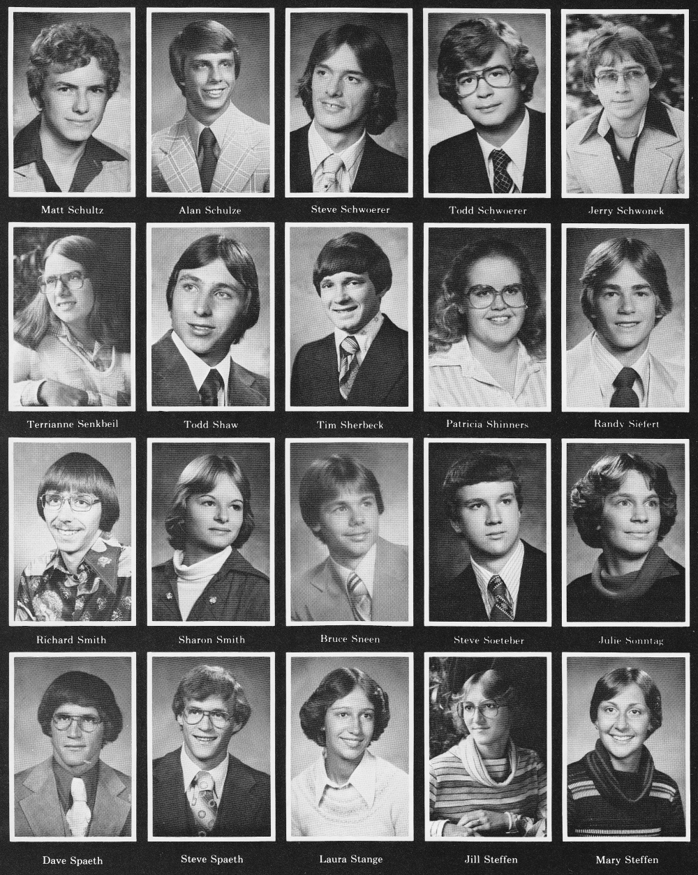 High School, Page 112: Matt Schultz, Alan Schulze, Steve Schwoerer, Todd Schwoerer, Jerry Schwonek, Terrianne Senkbeil, Todd Shaw, Tim Sherbeck, Patricia Shinners, Randy Siefert, Richard Smith, Sharon Smith, Bruce Sneen, Steve Soeteber, Julie Sonntag, Dave Spaeth, Steve Spaeth, Laura Stange, Jill Steffen, Mary Steffen.