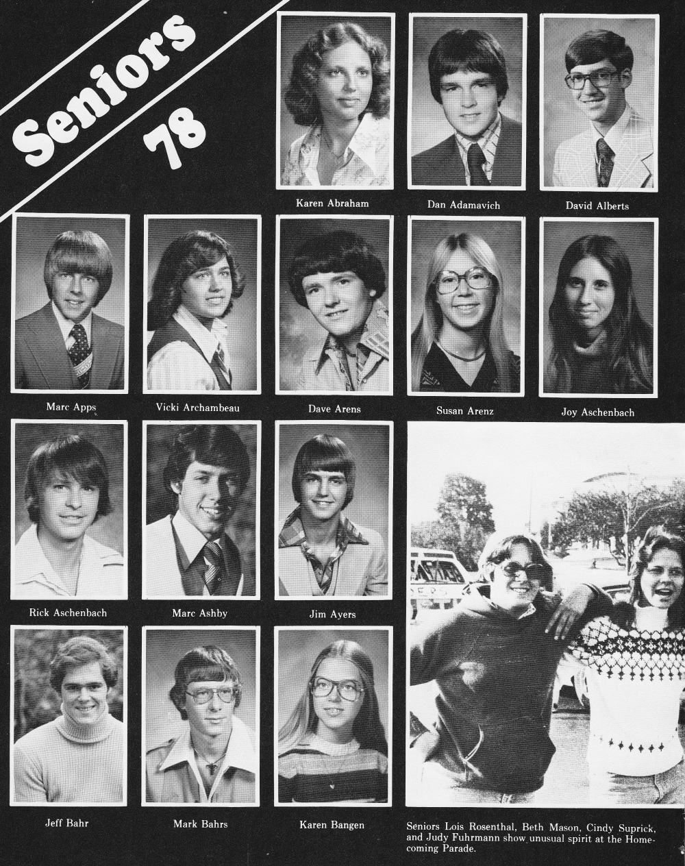 1978 Sheboygan North High School, Page 86: Karen Abraham, Dan Adamavich, David Alberts, Marc Apps, Vicki Archambeau, Dave Arens, Susan Arenz, Joy Aschenbach, Rick Aschenbach, Marc Ashby, Jim Ayers, Jeff Bahr, Mark Bahrs, Karen Bangen.