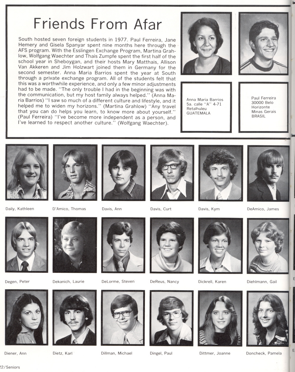 1978 Sheboygan South High School, Page 22: Kathleen Daily, Thomas D'Amico, Ann Davis, Curt Davis, Kym Davis, James DeAmico, Peter Degen, Laurie Dekanich, Steven DeLorme, Nancy DeReus, Karen Dickrell, Gail Diehlmann, Ann Diener, Karl Dietz, Michael Dillman, Paul Dingel, Joanne Dittmer, Pamela Doncheck.