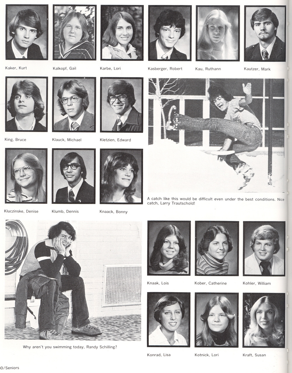 1978 Sheboygan South High School, Page 30: Kurt Kaker, Gail Kalkopf, Lori Karbe, Robert Kasberger, Ruthann Kau, Mark Kautzer, Bruce King, Michael Klauck, Edward Kletzien, Denise Kluczinske, Dennis Klumb, Bonny Knaack, Lois Knaak, Catherine Kober, William Kohler, Lisa Konrad, Lori Kotnick, Susan Kraft.