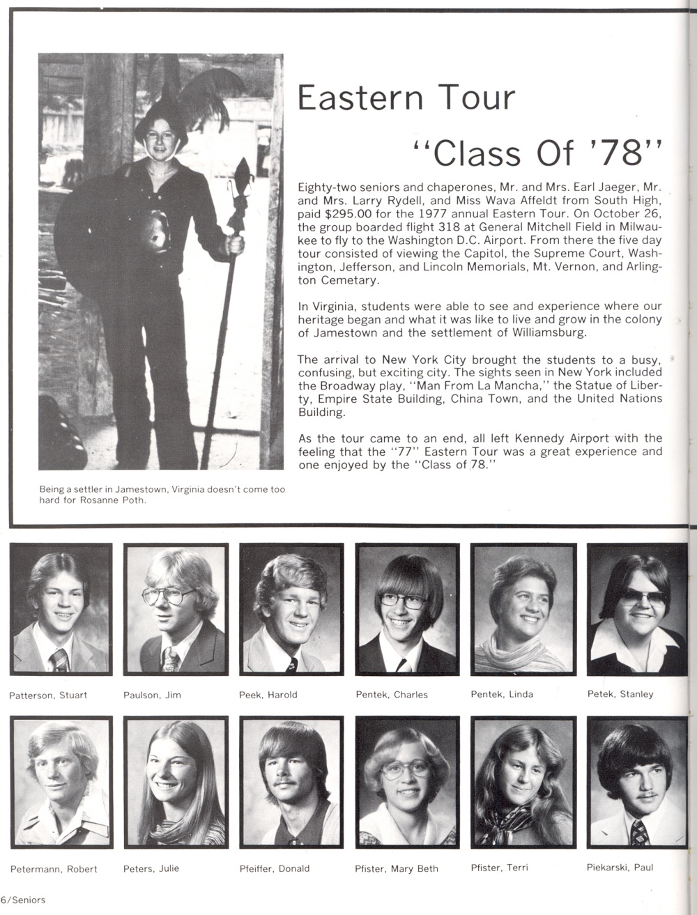 1978 Sheboygan South High School, Page 36: Stuart Patterson, Jim Paulson, Harold Peek, Charles Pentek, Linda Pentek, Stanley Petek, Robert Petermann, Julie Peters, Donald Pfeiffer, Mary Beth Pfister, Terri Pfister, Paul Piekarski.