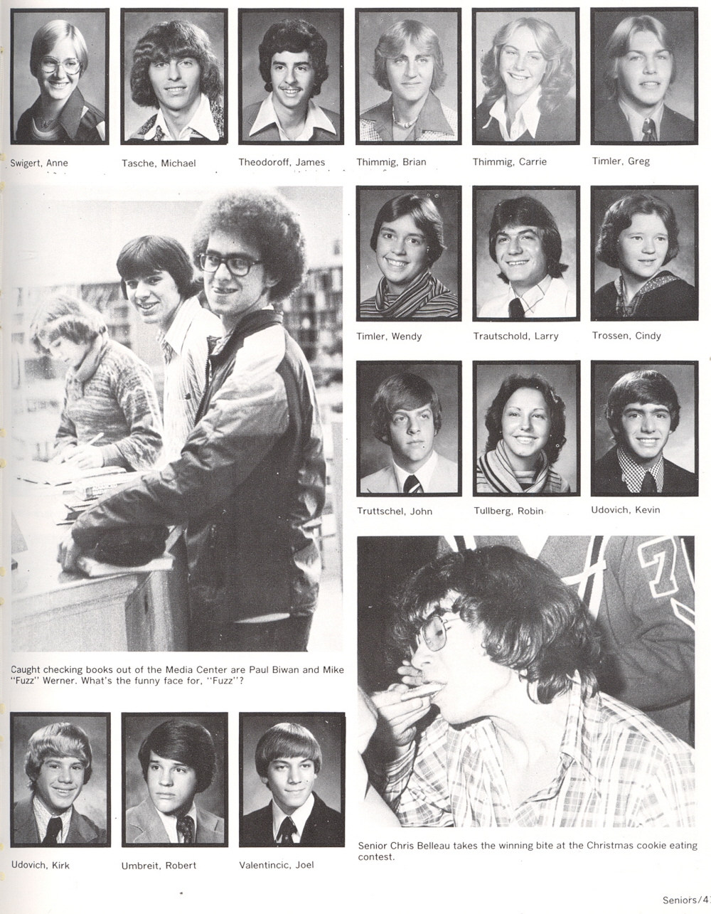 1978 Sheboygan South High School, Page 41: Anne Swigert, Michael Tasche, James Theodoroff, Brian Thimmig, Carrie Thimmig, Greg Timler, Wendy Timler, Larry Trautschold, Cindy Trossen, John Truttschel, Robin Tullberg, Kevin Udovich, Kirk Udovich, Robert Umbreit, Joel Valentincic.