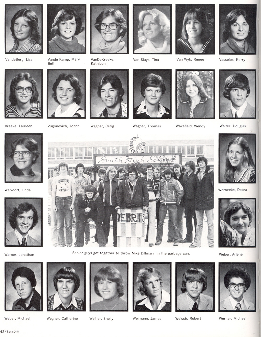 1978 Sheboygan South High School, Page 42: Lisa VandeBerg, Mary Beth Vande Kamp, Kathleen VanDeKreeke, Tina Van Sluys, Renee Van Wyk, Kerry Vasselos, Laureen Vreeke, Joann Vugrinovich, Craig Wagner, Thomas Wagner, Wendy Wakefield, Douglas Walter, Linda Walvoort, Debra Warnecke, Jonathan Warner, Arlene Weber, Michael Weber, Catherine Wegner, Shelly Weiher, James Weimann, Robert Welsch, Michael Werner.