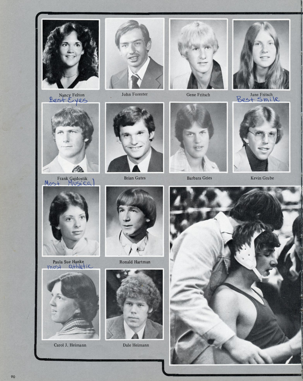 1979 Kiel High School Yearbook Page 90: Nancy Felton, John Forester, Gene Fritsch, Jane Fritsch, Frank Gajdostik, Brian Gates, Barbara Gries, Kevin Grube, Paula Sue Hanke, Ronald Hartman, Carol J. Heimann, Dale Heimann.