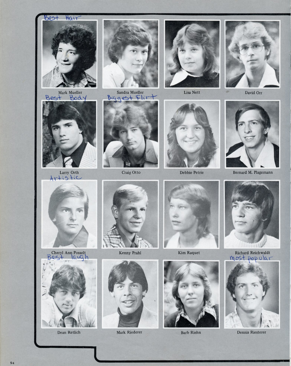 1979 Kiel High School Yearbook Page 94: Mark Mueller, Sandra Mueller, Lisa Nett, David Orr, Larry Orth, Craig Otto, Debbie Petrie, Bernard M. Plagemann, Cheryl Ann Posselt,