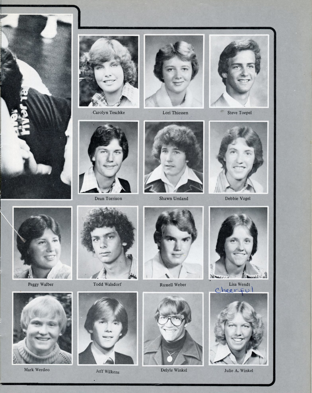 1979 Kiel High School Yearbook Page 97: Carolyn Teschke, Lori Thiessen, Steve Toepel, Dean Torrison, Shawn Umland, Debbie Vogel, Peggy Walber, Todd Walsdorf, Russell Weber, Lisa Wendt, Mark Werdeo, Jeff Wilkens, Delyle Winkel, Julie A. Winkel.