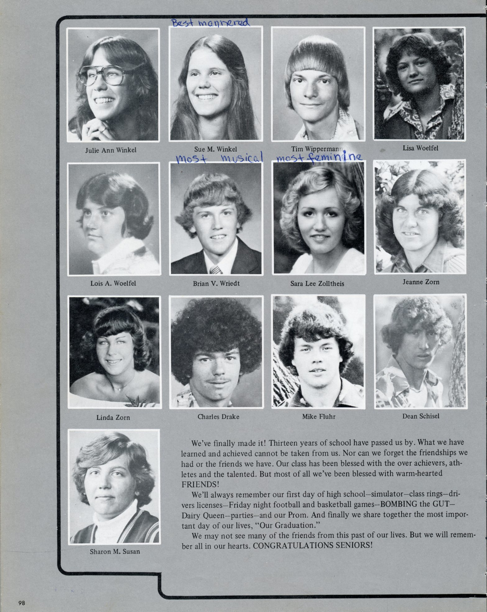 1979 Kiel High School Yearbook Page 98: Julie Ann Winkel, Sue M. Winkel, Tim Wippermann, Lisa Woelfel, Lois A. Woelfel, Brian V. Wriedt, Sara Lee Zolltheis, Jeanne Zorn, Linda Zorn, Charles Drake, Mike Fluhr, Dean Schisel, Sharon M. Susan.