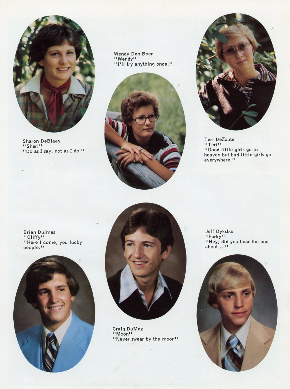 1979 Oostburg High School Yearbook Page 13: Sharon DeBlaey, Wendy Den Boer, Teri DeZoute, Brian Dulmes, Craig DuMez, Jeff Dykstra.