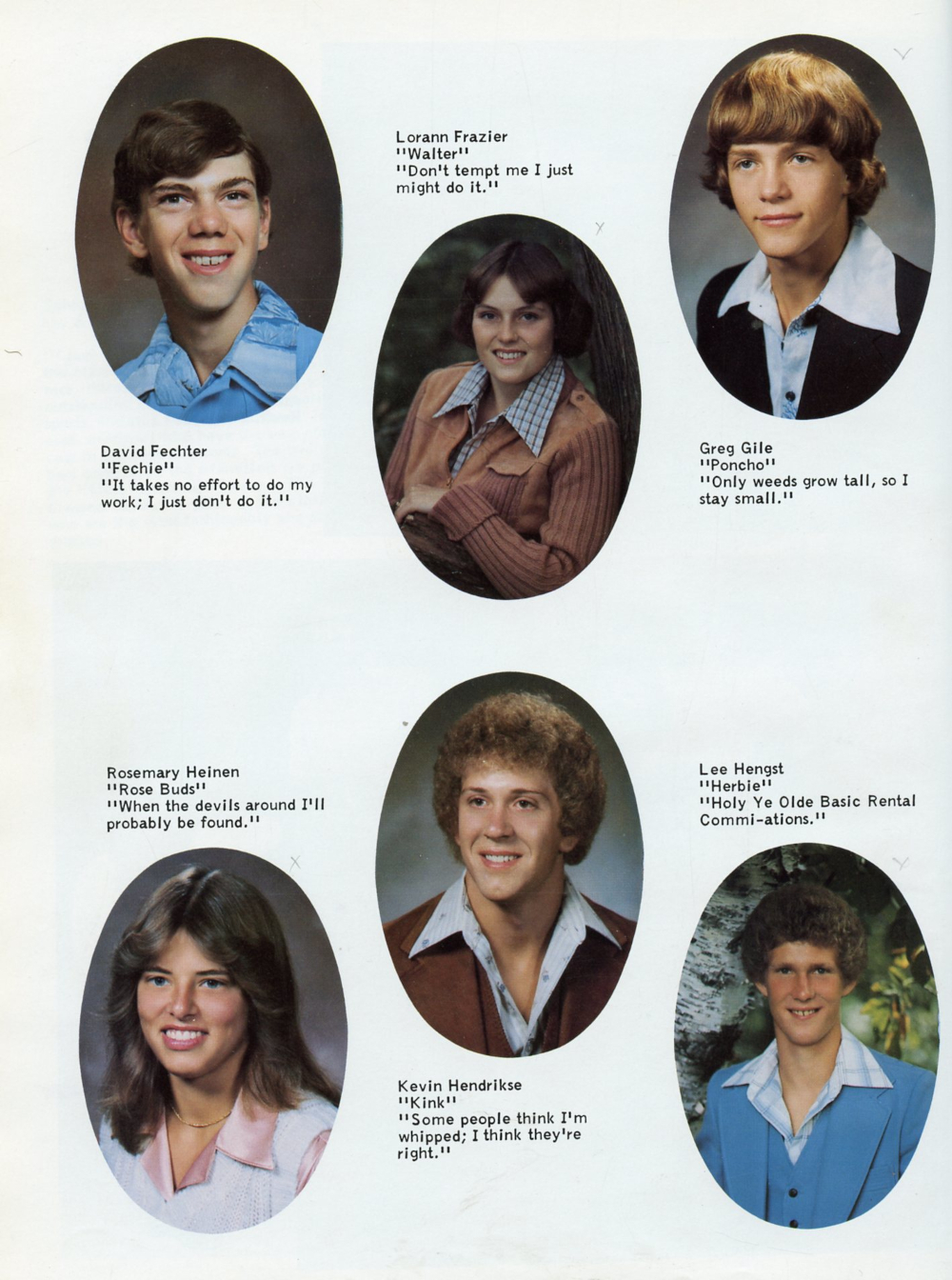 1979 Oostburg High School Yearbook Page 16: David Fechter, Lorann Frazier, Greg Gile, Rosemary Heinen, Kevin Hendrikse, Lee Hengst.