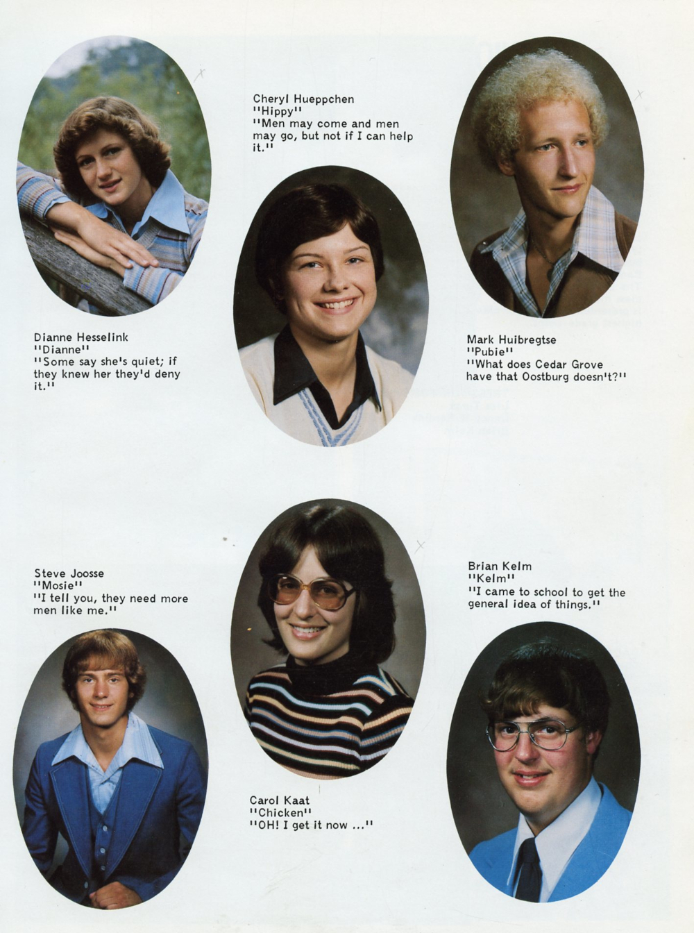 1979 Oostburg High School Yearbook Page 17: Dianne Hesselink, Cheryl Hueppchen, Mark Huibregtse, Steve Joosse, Carol Kaat, Brian Kelm.