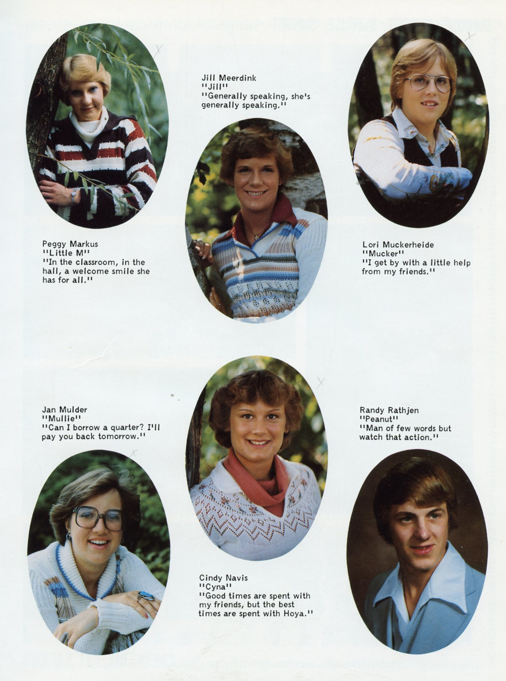 1979 Oostburg High School Yearbook Page 21: Peggy Markus, Jill Meerdink, Lori Muckerheide, Jan Mulder, Cindy Navis, Randy Rathjen.
