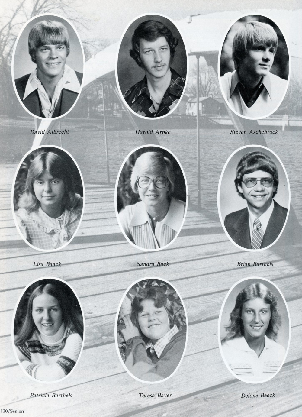1979 Sheboygan Falls High School Yearbook Page 120: David Albrecht, Harold Arpke, Steven Aschebrock, Lisa Baack, SAndra Back, Brian Barthels, Patricia Barthels, Teresa Bayer, Deione Beeck.