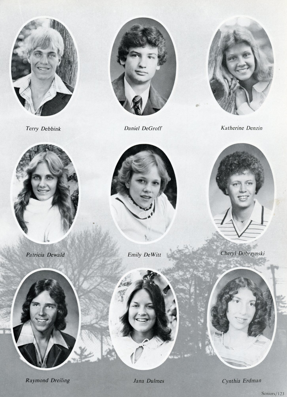 1979 Sheboygan Falls High School Yearbook Page 123: Terry Debbink, Daniel DeGroff, Katherine Denzin, Patricia Dewald, Emily DeWitt, Cheryl Dobrzynski, Raymond Dreiling, Jana Dulmes, Cynthia Erdman.