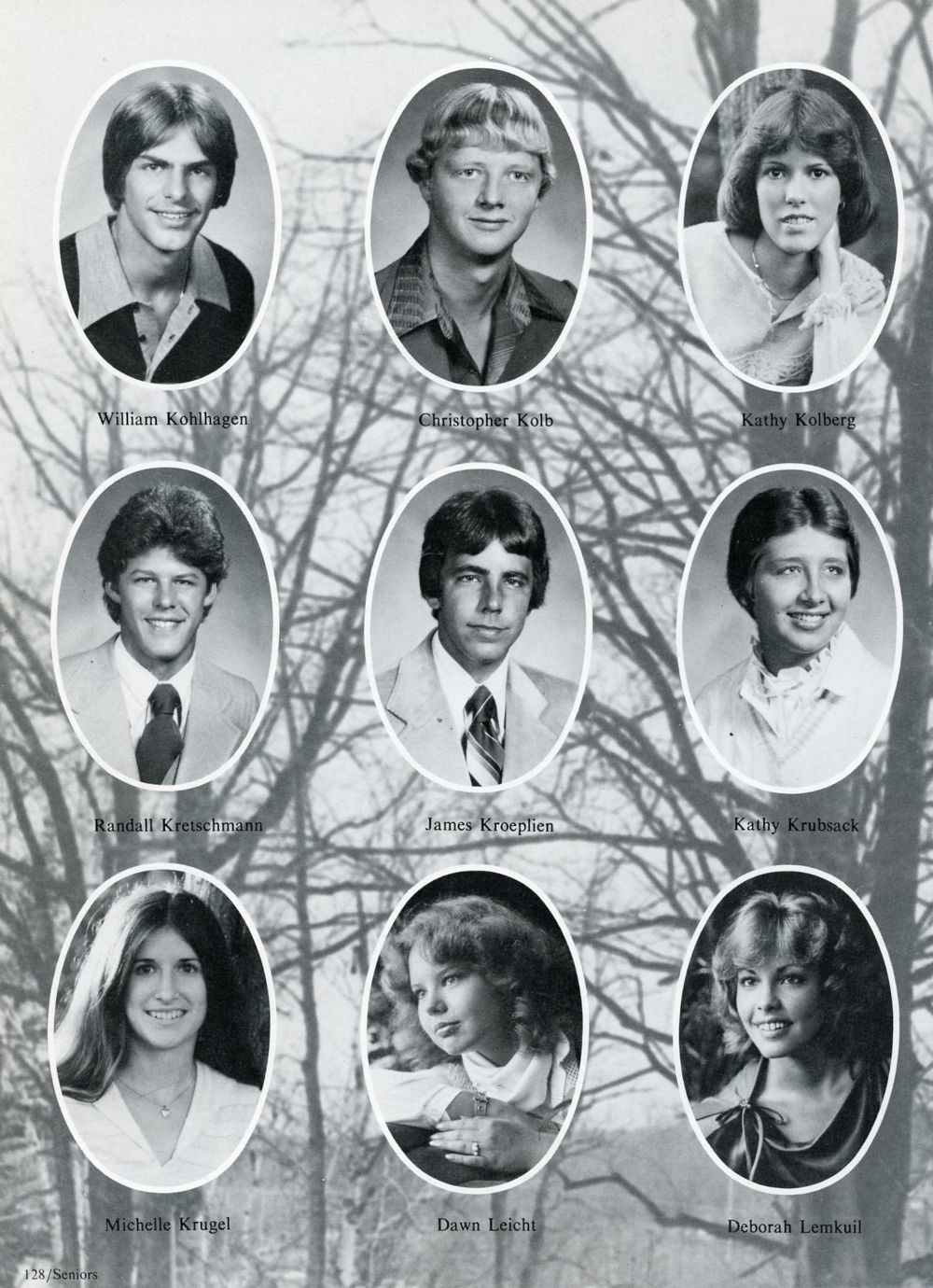 1979 Sheboygan Falls High School Yearbook Page 128: William Kohlhagen, Christopher Kolb, Kathy Kolberg, Randall Kretschmann, James Kroeplien, Kathy Krubsack, Michelle Krugel, Dawn Leicht, Deborah Lemkuil.