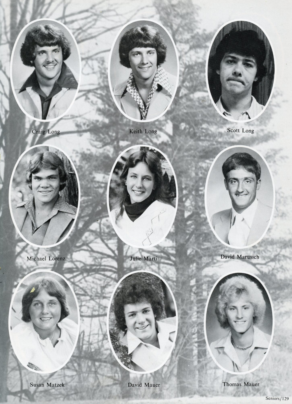 1979 Sheboygan Falls High School Yearbook Page 129: Craig Long, Keith Long, Scot Long, Michael Lorenz, Julie Marti, David Marusich, Susan Matzek, David Mauer, Thomas Mauer.