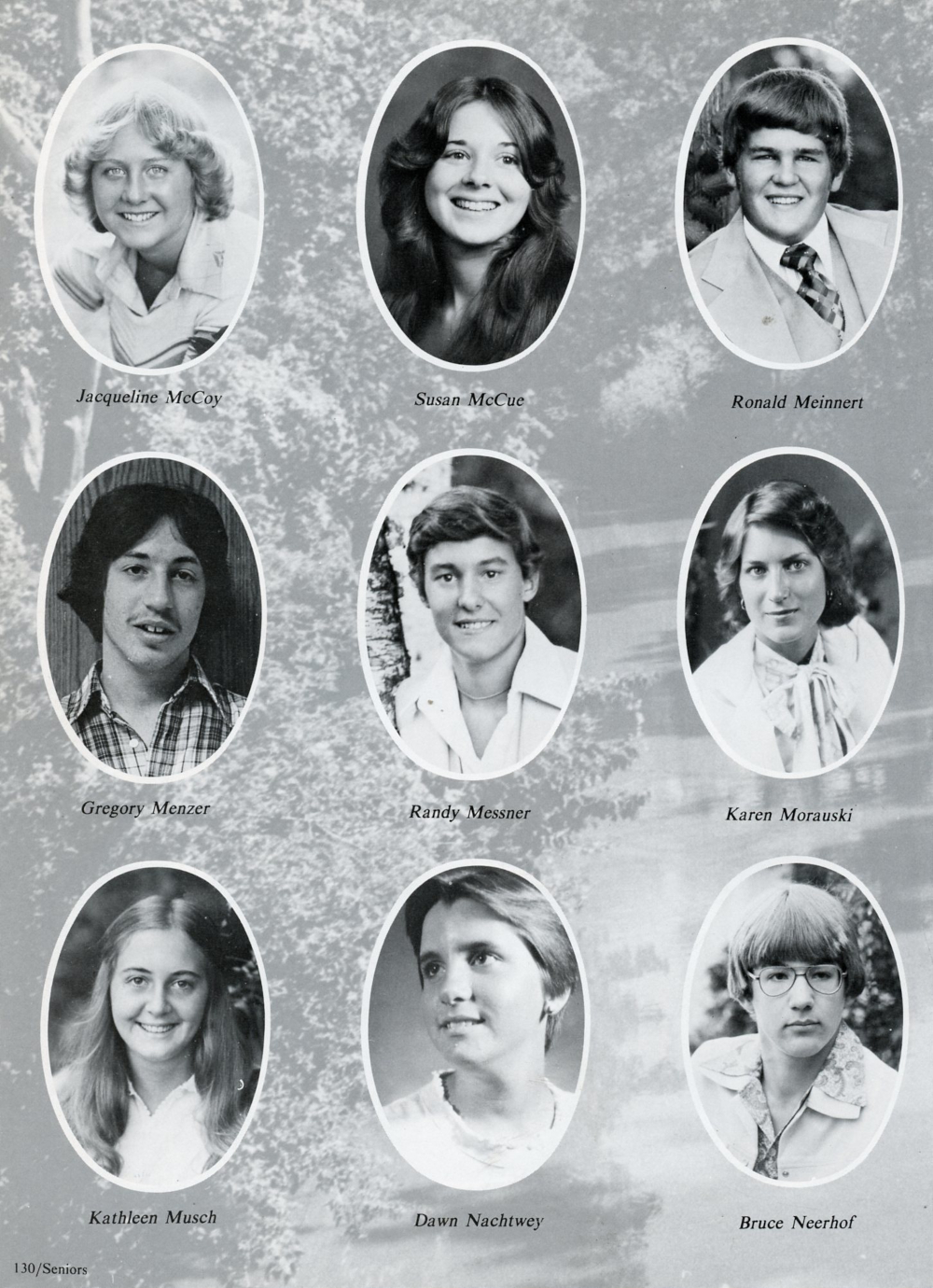 1979 Sheboygan Falls High School Yearbook Page 130: Jacqueline McCoy, Susan McCue, Ronald Meinnert, Gregory Menzer, Randy Messner, Karen Morauski, Kathleen Musch, Dawn Nachtwey, Bruce Neerhof.