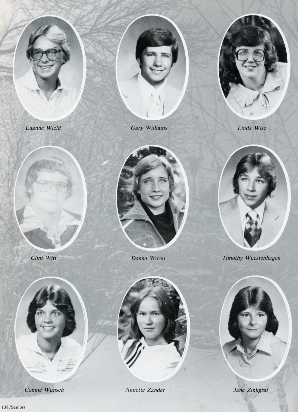 1979 Sheboygan Falls High School Yearbook Page 138: Luanne Wield, Gary Williams, Linda Wise, Clint Witt, Donna Worm, Timothy Wuestenhagen, Connie Wunsch, Annette Zander, Jane Zinkgraf.