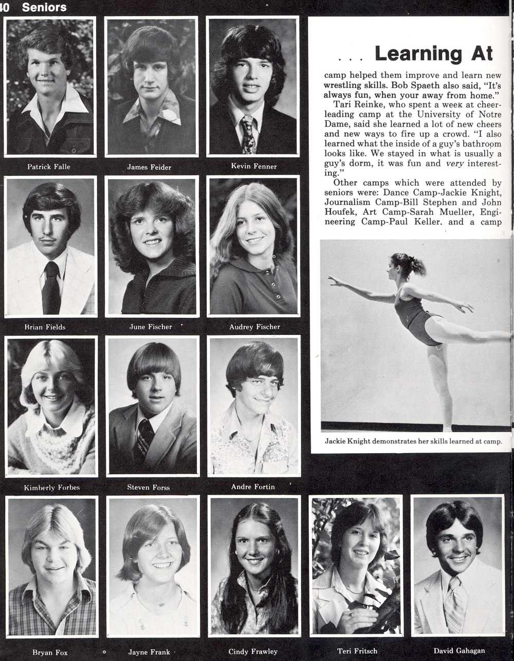 1979 Sheboygan North High School, Page 140: Patrick Falle, James Feider, Kevin Fenner, Brian Fields, June Fischer, Audrey Fischer, Kimberly Forbes, Steven Forss, Andre Fortin, Bryan Fox, Jayne Frank, Cindy Frawley, Teri Fritsch, David Gahagan.