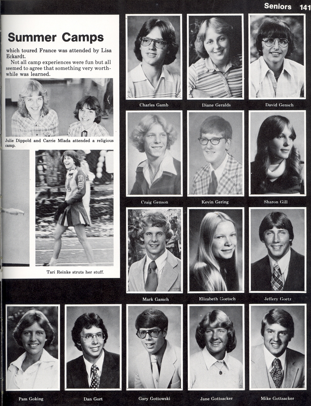 1979 Sheboygan North High School, Page 141: Charles Gamb, Diane Gearlds, David Gensch, Craig Genson, Kevin Gering, Sharon Gill, Mark Gmach, Elizabeth Goetsch, Jeffrey Goetz, Pam Goking, Dan Gort, Gary Gottowski, Jane Gottsacker, Mike Gottsacker.