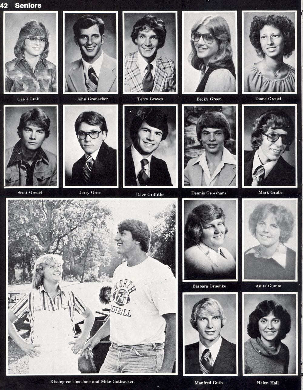 1979 Sheboygan North High School, Page 142: Carol Graff, John Granacker, Terry Graves, Becky Green, Diane Greuel, Scott Greuel, Jerry Gries, Dave Griffiths, Dennis Grosshans, Mark Grube, Barbara Gruenke, Anita Gumm, Manfred Guth, Helen Hall.