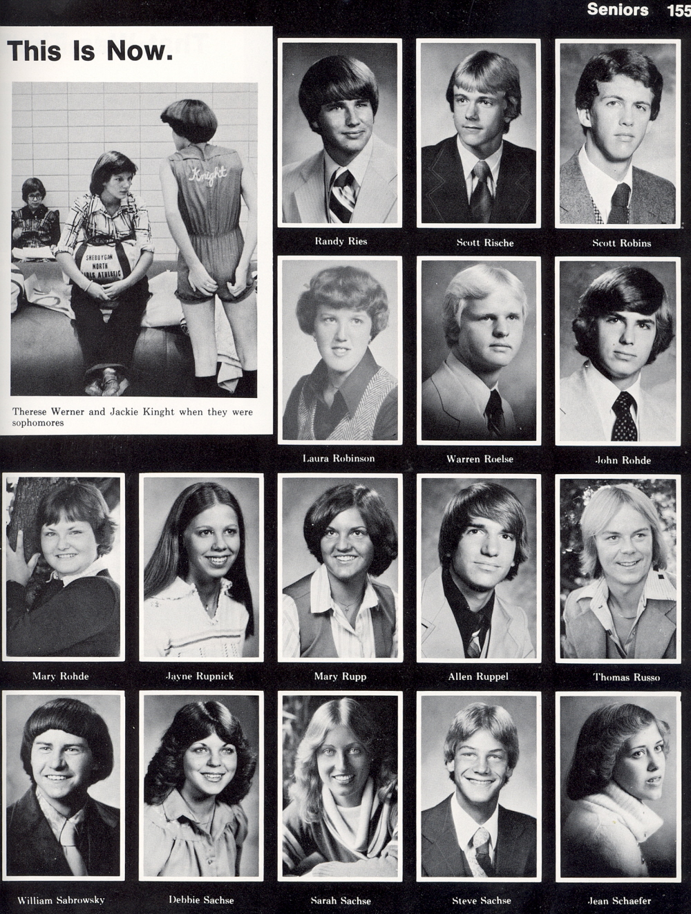 High School, Page 155: Randy Ries, Scott Rische, Scott Robins, Laura Robinson, Warren Roelse, John Rohde, Mary Rohde, Jayne Rupnick, Mary Rupp, Allen Ruppel, Thomas Russo, William Sabrowsky, Debbie Sachse, Sarah Sachse, Steve Sachse, Jean Schaefer.