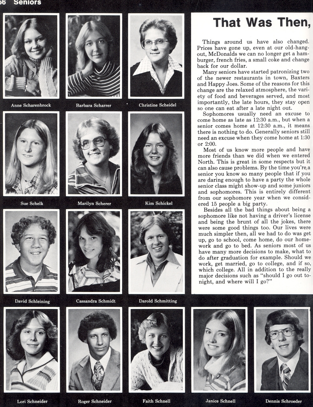 High School, Page 156: Anne Scharenbrock, Barbara Scharrer, Christine Scheidel, Sue Schelk, Marilyn Scherer, Kim Schickel, David Schleining, Cassandra Schmidt, Darold Schmitting, Lori Schneider, Roger Schneider, Faith Schnell, Janice Schnell, Dennis Schroeder.