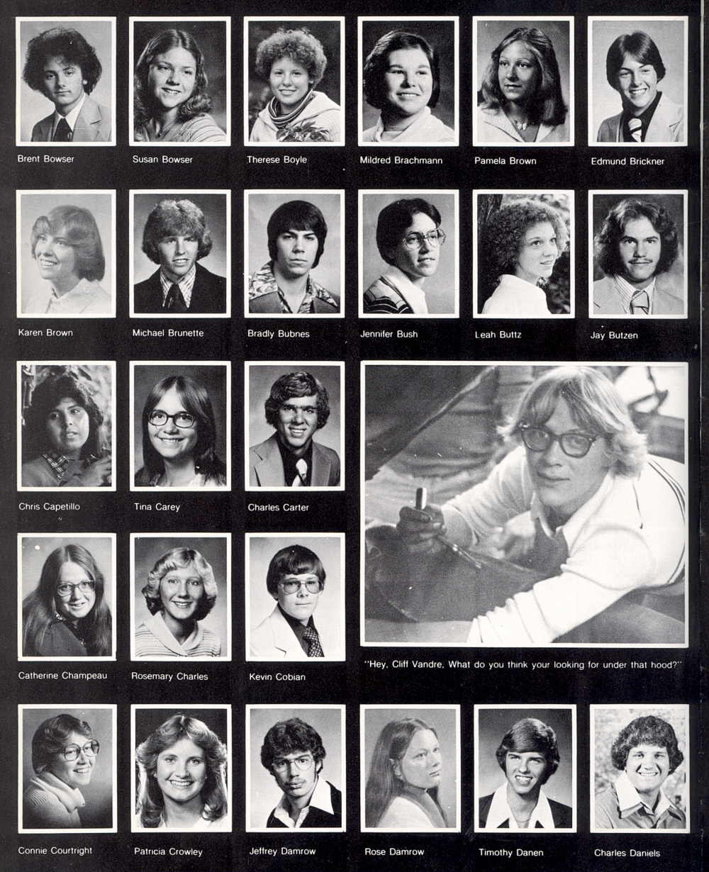 High School, Page 28: Brent Bowser, Susan Bowser, Therese Boyle, Mildred Brachmann, Pamela Brown, Edmund Brickner, Karen Brown, Michael Brunette, Bradley Bubnes, Jennifer Bush, Leah Buttz, Jay Butzen, Chris Capetillo, Tina Carey, Charles Carter, Catherine Champeau, Rosemary Charles, Kevin Cobain, Connie Courtright, Patricia Crowley, Jeffrey Damrow, Rose Damrow, Timothy Danen, Charles Daniels.