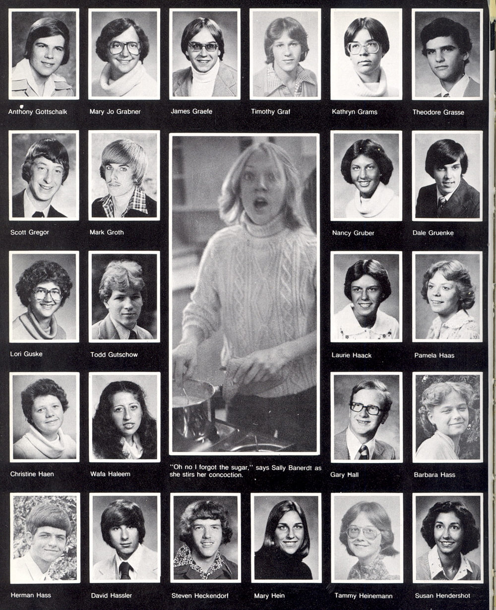 High School, Page 32: Anthony Gottschalk, Mary Jo Grabner, James Graefe, Timothy Graf, Kathryn Grams, Theodore Grasse, Scott Gregor, Mark Groth, Nancy Gruber, Dale Gruenke, Lori Guske, Todd Gutschow, Laurie Haack, Pamela Haas, Christine Haen, Wafa Haleen, Gary Hall, Barbara Hass, Herman Hass, David Hassler, Steven Heckendorf, Mary Hein, Tammy Heinemann, Susan Hendershot.