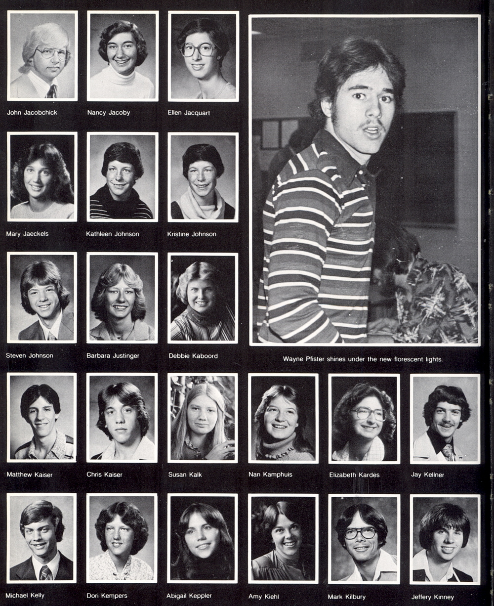 High School, Page 34: John Jacobchick, Nancy Jacoby, Ellen Jacquart, Mary Jaeckels, Kathleen Johnson, Kristine Johnson, Steven Johnson, Barbara Justinger, Debbie Kaboord, Matthew Kaiser, Chris Kaiser, Susan Kalk, Nan Kamphuis, Elizabeth Kardes, Jay Kellner, Michael Kelly, Dori Kempers, Abigail Keppler, Amy Kiehl, Mark Kilbury, Jeffery Kinney.
