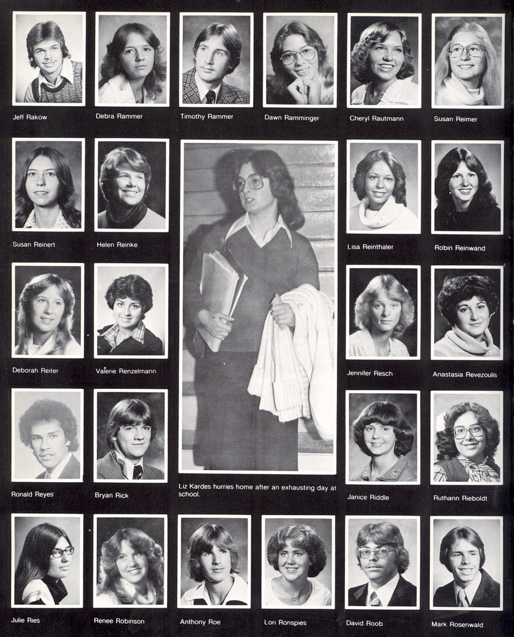 High School, Page 42: Jeff Rakow, Debra Rammer, Timothy Rammer, Dawn Ramminger, Cheryl Rautmann, Susan Reimer, Susan Reinert, Helen Reinke, Lisa Reinthaler, Robin Reinwand, Deborah Reiter, Valerie Renzelmann, Jennifer Resch, Anastasia Revezoulis, Ronald Reyes, Bryan Rick, Janice Riddle, Ruthann Rieboldt, Julie Ries, Renee Robinson, Anthony Roe, Lori Ronspies, David Roob, Mark Rosenwald.