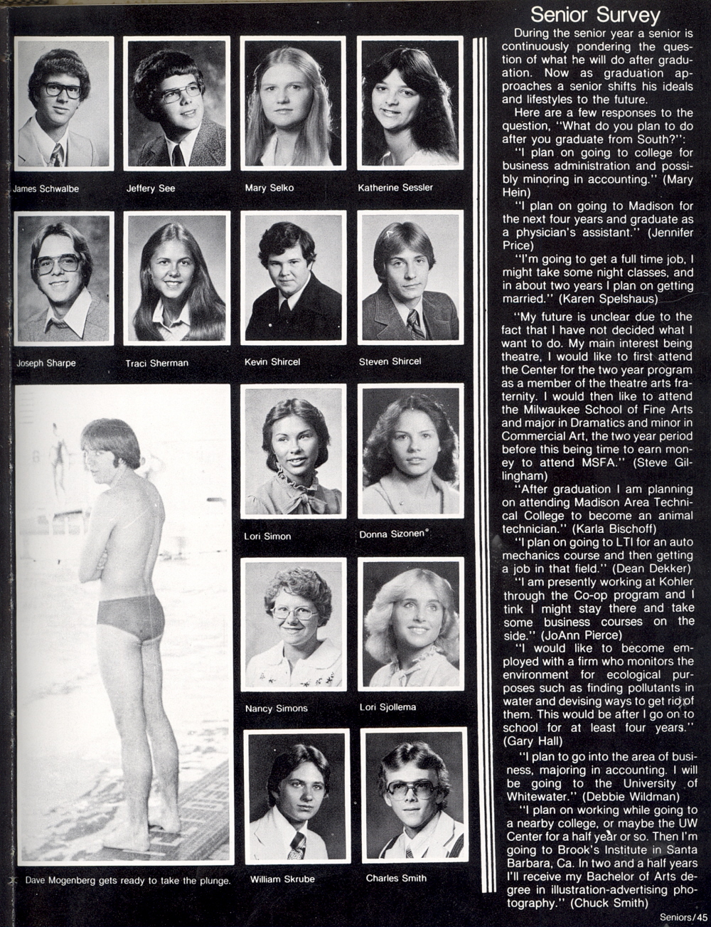 High School, Page 45: James Schwalbe, Jeffery See, Mary Selko, Katherine Sessler, Joseph Sharpe, Traci Sherman, Kevin Shircel, Steven Shircel, Lori Simon, Donna Sizonen, Nancy Simons, Lori Sjollema, William Skrube, Charles Smith.