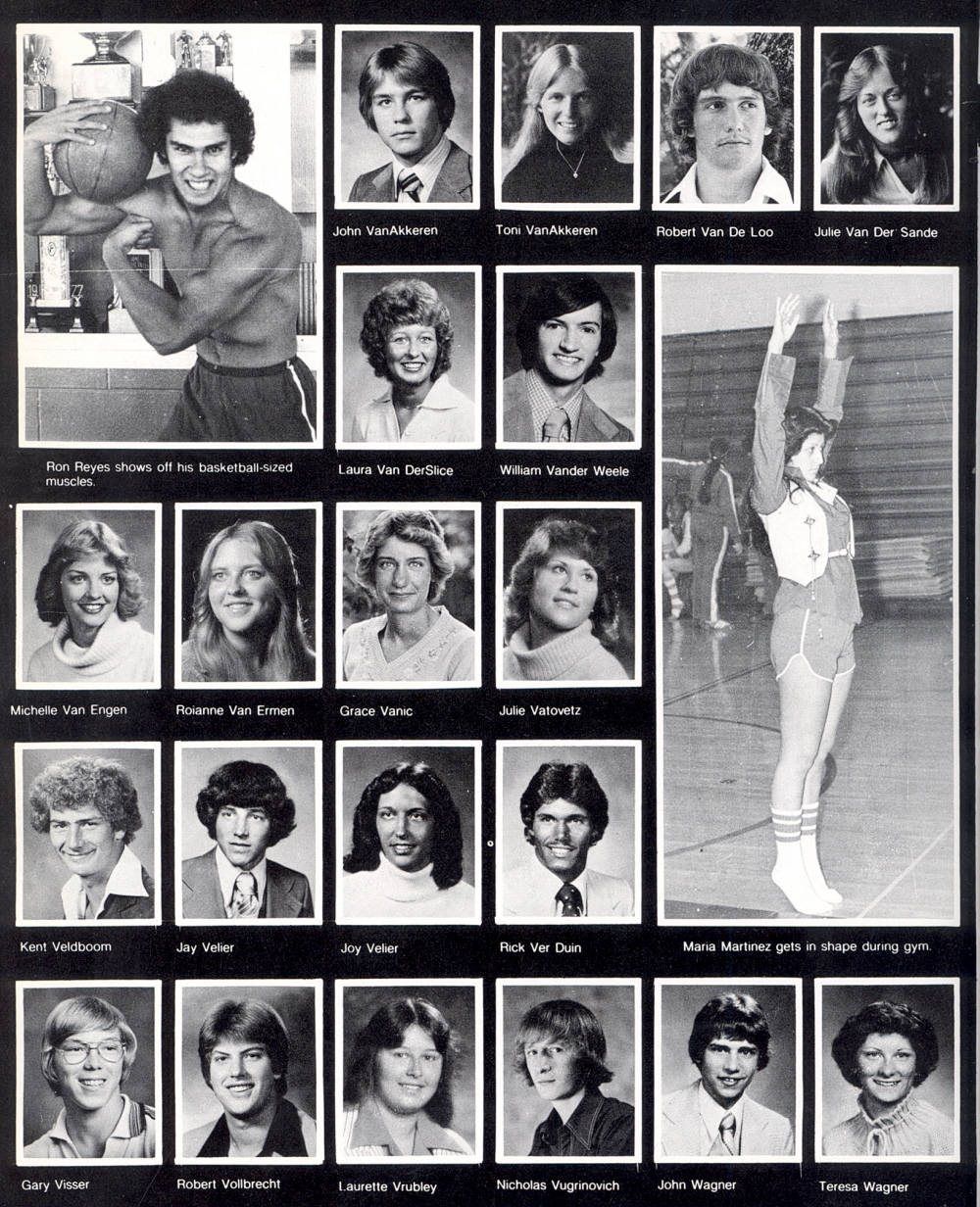 High School, Page 48: John VanAkkeren, Toni VanAkkeren, Robert Van De Loo, Julie Van Der Sande, Laura Van DerSlice, William Vander Weele, Michelle Van Engen, Roianne Van Ermen, Grace Vanic, Julie Vatovetz, Kent Veldboom, Jay Velier, Joy Velier, Rick Ver Duin, Gary Visser, Robert Vollbrecht, Laurette Vrubley, Nicholas Vugrinovich, John Wagner, Teresa Wagner.