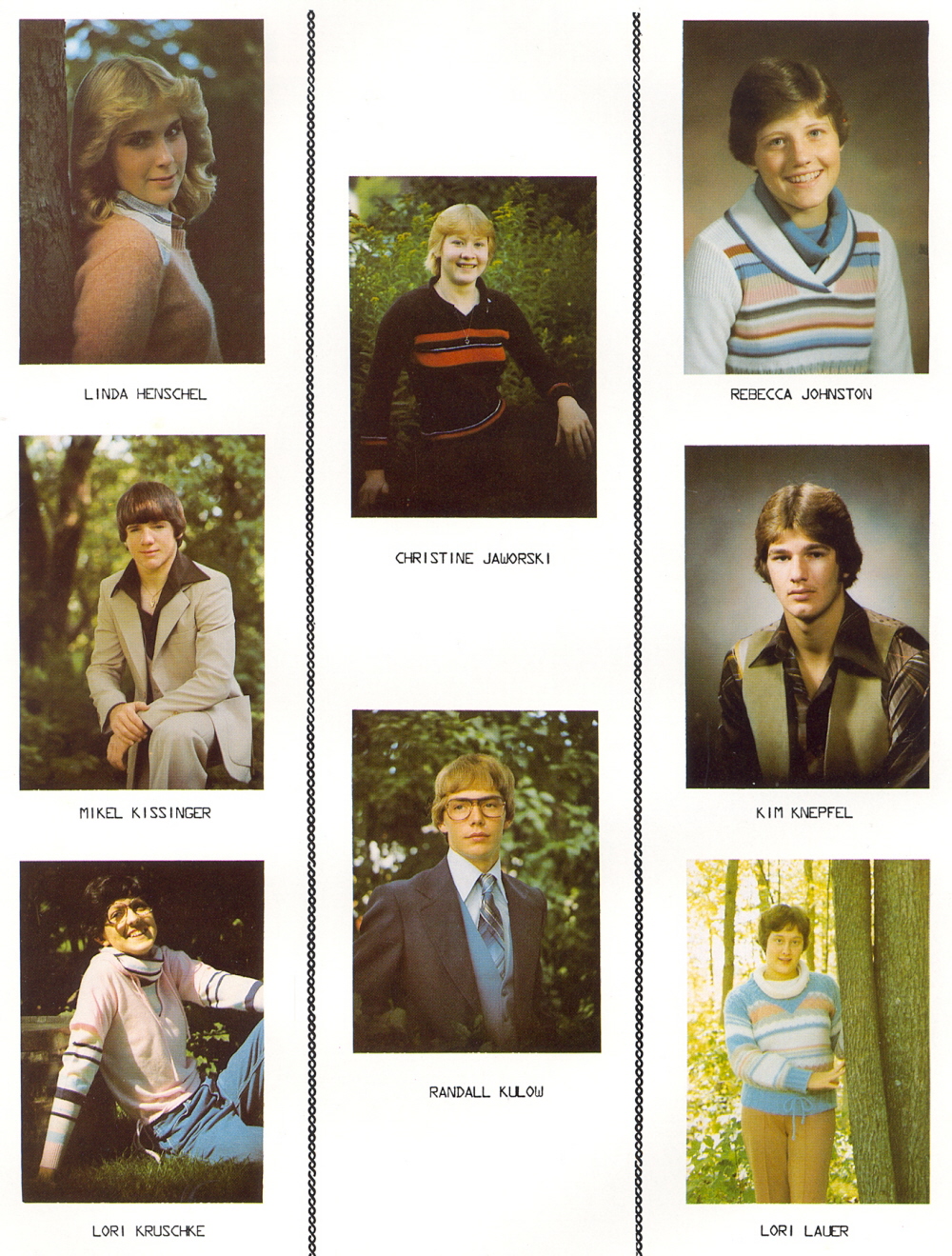 1980 Elkhart Lake High School, Page 106: Linda Henschel, Christine Jaworski, Rebecca Johnson, Mikel Kissinger, Kim Knepfel, Lori Kruschke, Randall Kulow, Lori Lauer.