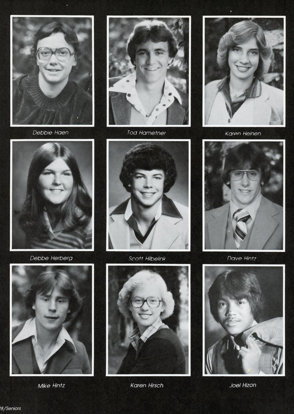 1980 Sheboygan Falls High School Yearbook, page 128: Debbie Haen, Tod Hametner, Karen Heinen, Debbe Herberg, Scott Hilbelink, Dave Hintz, Mike Hintz, Karen Hirsch, Joel Hizon.