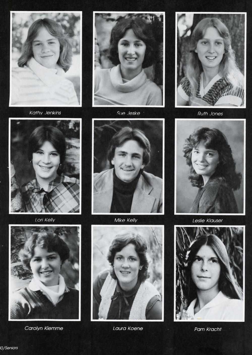 1980 Sheboygan Falls High School Yearbook, page 130: Kathy Jenkins, Sue Jeske, Ruth Jones, Lori Kelly, Mike Kelly, Leslie Klauser, Carolyn Klemme, Laura Koene, Pam Kracht.