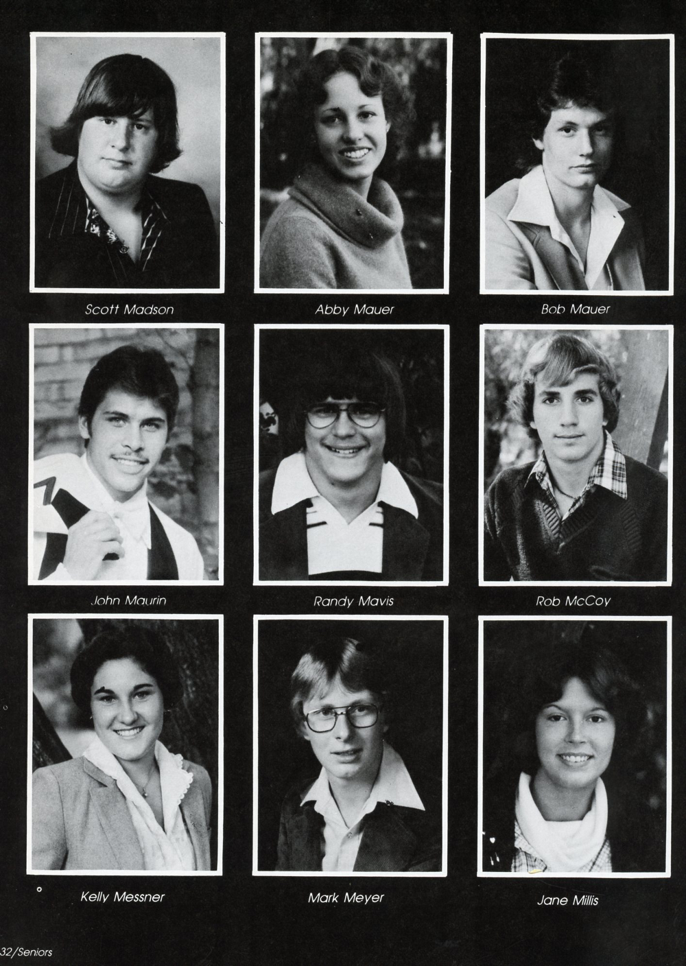 1980 Sheboygan Falls High School Yearbook, page 132: Scott Madson, Abby Mauer, Bob Mauer, John Maurin, Randy Mavis, Rob McCoy, Kelly Messner, Mark Meyer, Jane Millis.