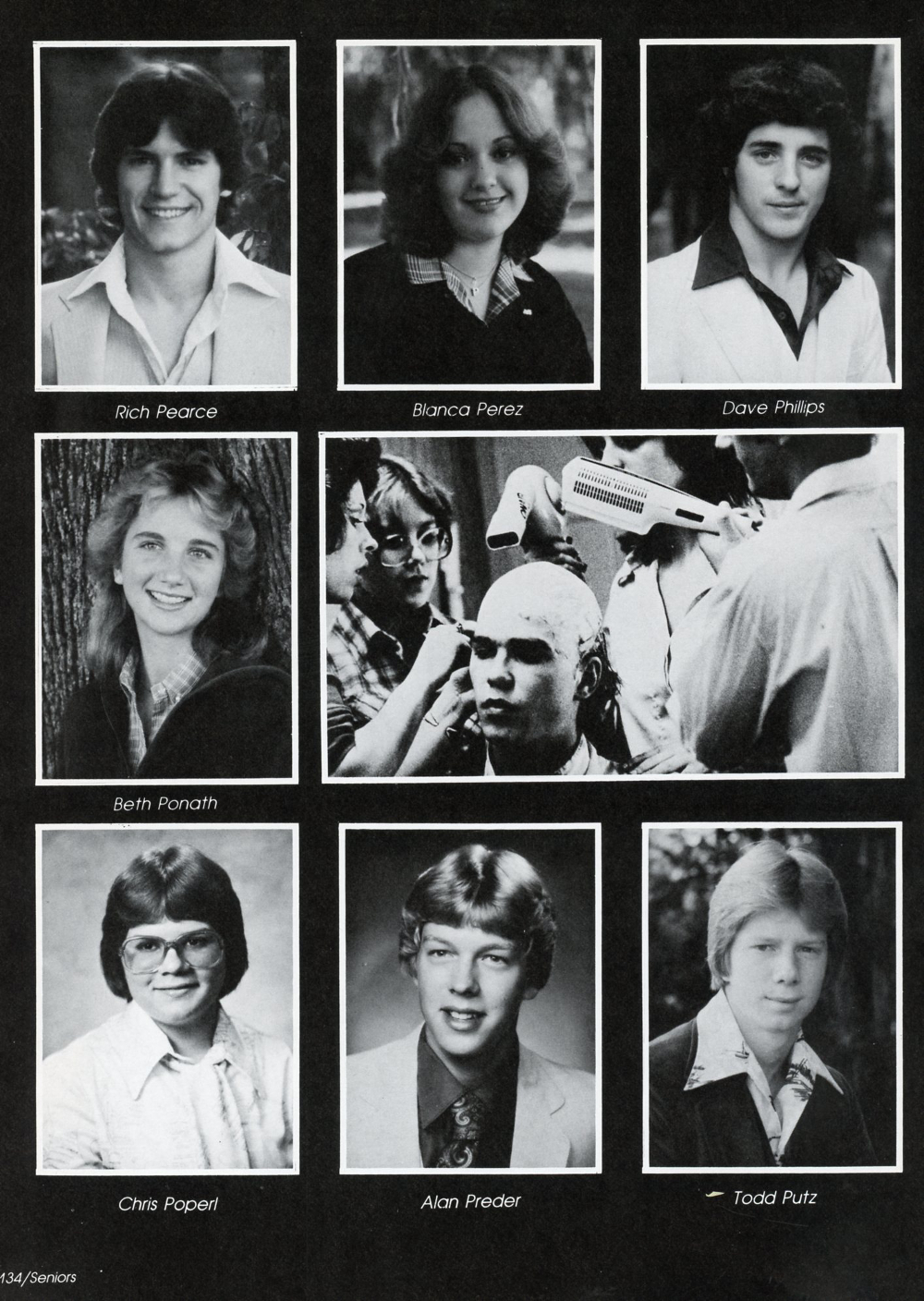 1980 Sheboygan Falls High School Yearbook, page 134: Rich Pearce, Blanca Perez, Dave Phillips, Beth Ponath, Chris Poperl, Alan Preder, Todd Putz.