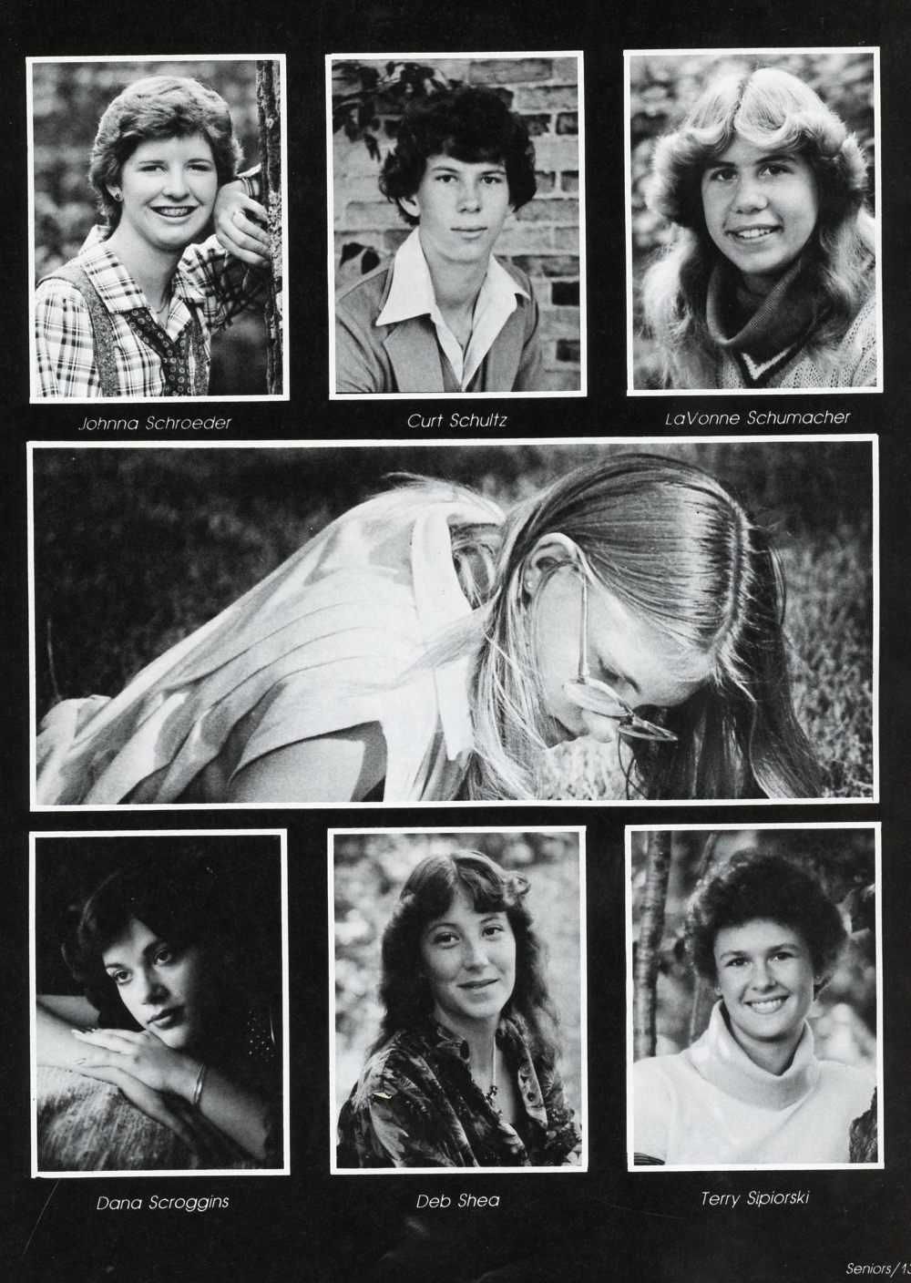 1980 Sheboygan Falls High School Yearbook, page 137: Johnna Schroeder, Curt Schultz, LaVonne Schumacher, Dana Scroggins, Deb Shea, Terry Sipiorski.