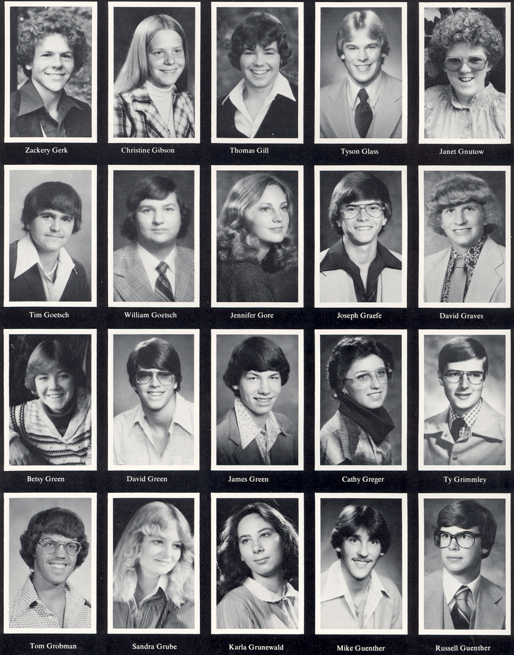 1980 Sheboygan North High School, Page 140: Zackery Gerk, Christine Gibson, Thomas Gill, Tyson Glass, Janet Gnutow, Tim Goetsch, William Goetsch, Jennifer Gore, Joseph Graefe, Betsy Green, David Green, James Green, Cathy Greger, Ty Grimmley, Tom Grobman, Sandra Grube, Karla Grunewald, Mike Guenther, Russell Guenther.