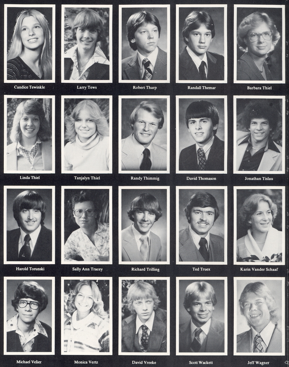 1980 Sheboygan North High School, Page 158: Candice Tewinkle, Larry Tews, Robert Tharp, Randall Themar, Barbara Thiel, Linda Thiel, Tanjalyn Thiel, Randy Thimmig, David Thomason, Jonathan Tislau, Harold Torunski, Sally Ann Tracey, Richard Trilling, Ted Truex, Karin Vander Schaaf, Michael Velier, Monica Vertz, David Vreeke, Scott Wackett, Jeff Wagner.