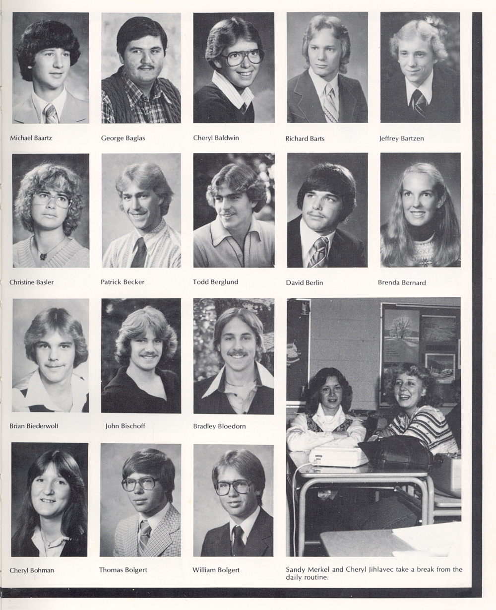 1980 Sheboygan South High School, Page 19: Michael Baartz, George Baglas, Cheryl Baldwin, Richard Barts, Jeffrey Bartzen, Christine Basler, Patrick Becker, Todd Berglund, David Berlin, Brenda Bernard, Brian Biederwolf, John Bischoff, Bradley Bloedorn, Cheryl Bohman, Thomas Bolgert, William Bolgert.