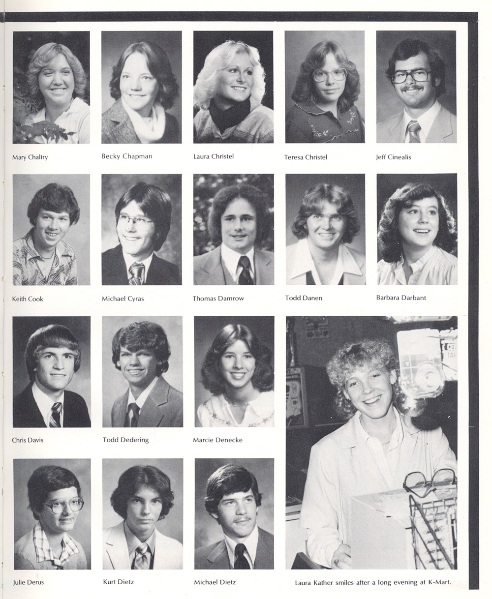 1980 Sheboygan South High School, Page 21: Mary Chaltry, Bechy Chapman, Laura Christel, Teresa Christel, Jeff Cinealis, Keith Cook, Michael Cyras, Thomas Damrow, Todd Danen, Barbara Darbant, Chris Davis, Todd Dedering, Marcie Denecke, Julie Derus, Kurt Dietz, Michael Dietz.