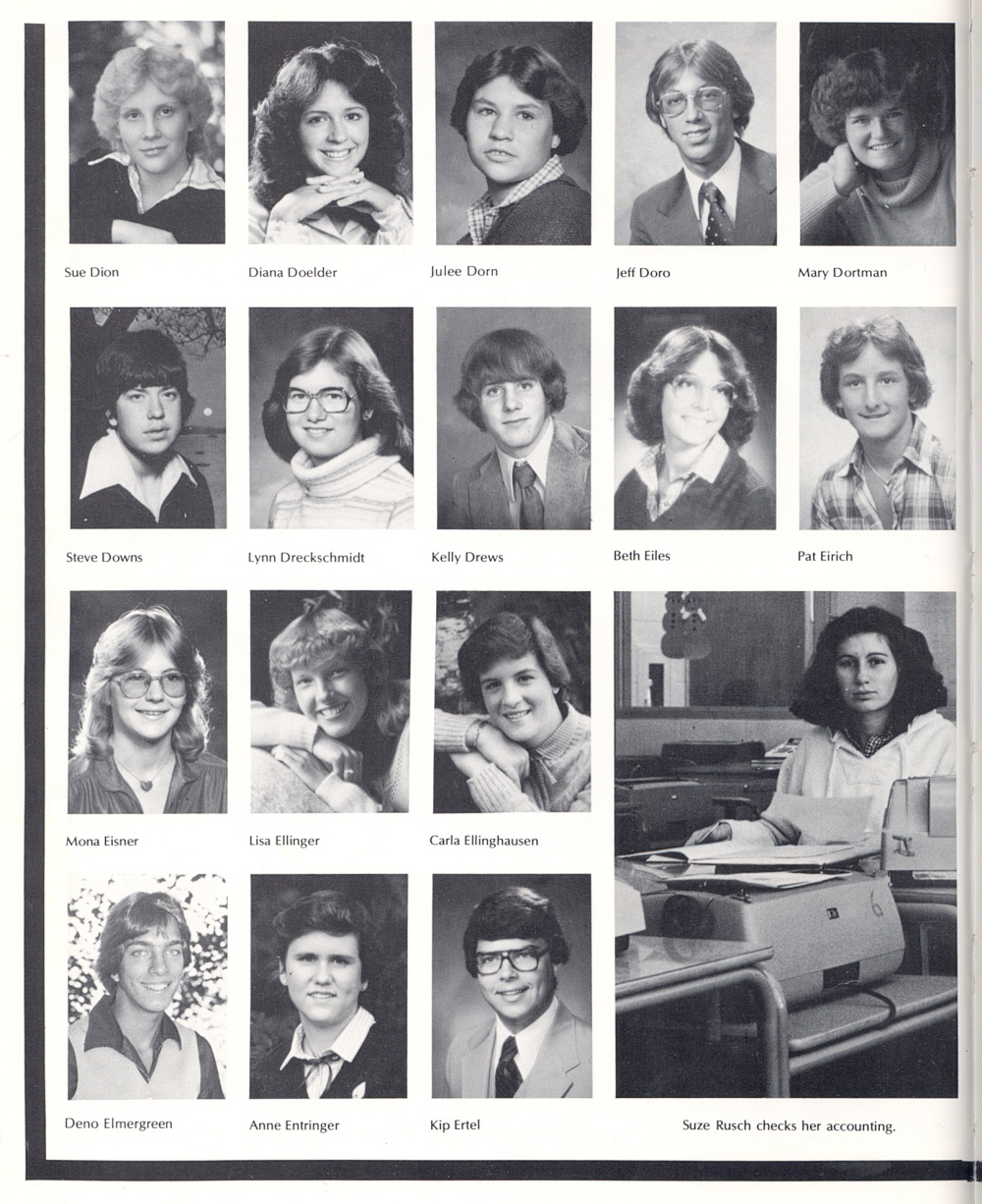 1980 Sheboygan South High School, Page 22: Sue Dion, Diana Doelder, Julee Dorn, Jeff Doro, Mary Dortman, Steve Downs, Lynn Dreckschmidt, Kelly Drews, Beth Eiles, Pat Eirich, Mona Eisner, Lisa Ellinger, Carla Ellinghausen, Deno Elmergreen, Anne Entringer, Kip Ertel.