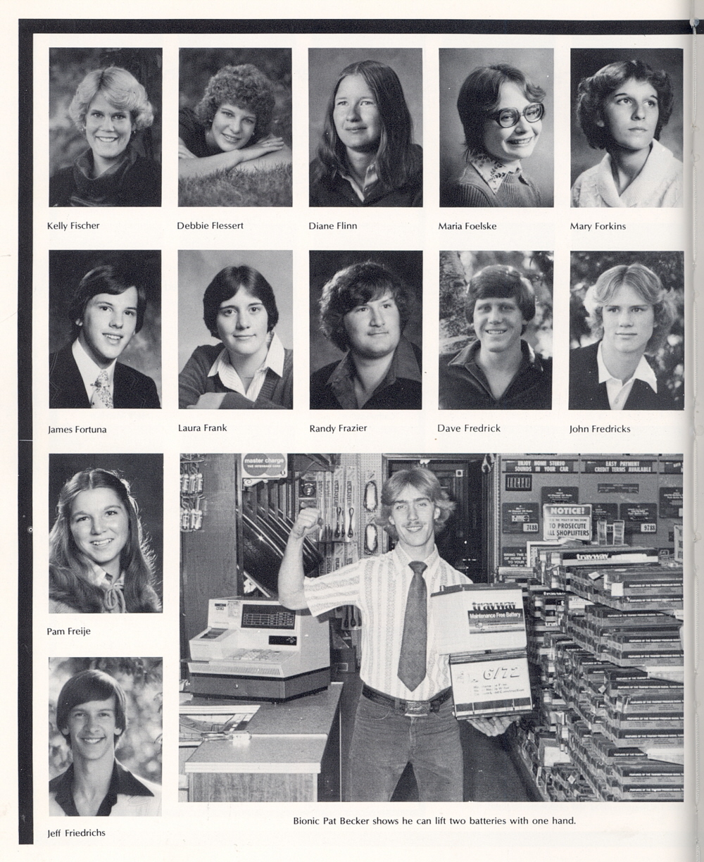 1980 Sheboygan South High School, Page 24: Kelly Fischer, Debbie Flessert, Diane Flinn, Maria Foelske, Mary Forkins, James Fortuna, Laura Frank, Randy Frazier, Dave Fredrick, John Fredricks, Pam Freije, Jeff Friedrichs.