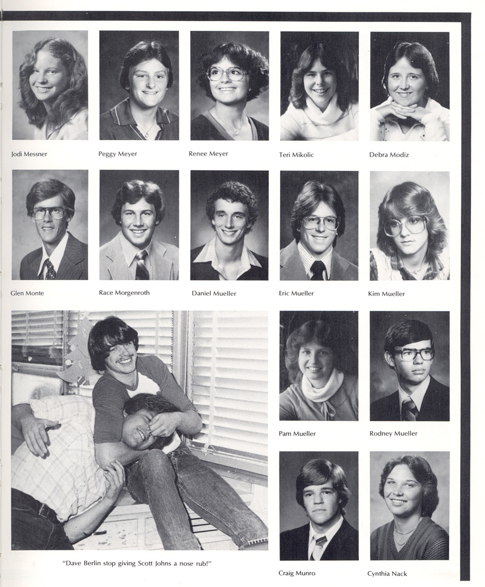 1980 Sheboygan South High School, Page 39: Jodi Messner, Peggy Meyer, Renee Meyer, Teri Mikolic, Debra Modiz, Glen Monte, Race Morgenroth, Daniel Mueller, Eric Mueller, Kim Mueller, Pam Mueller, Rodney Mueller, Craig Munro, Cynthia Nack.