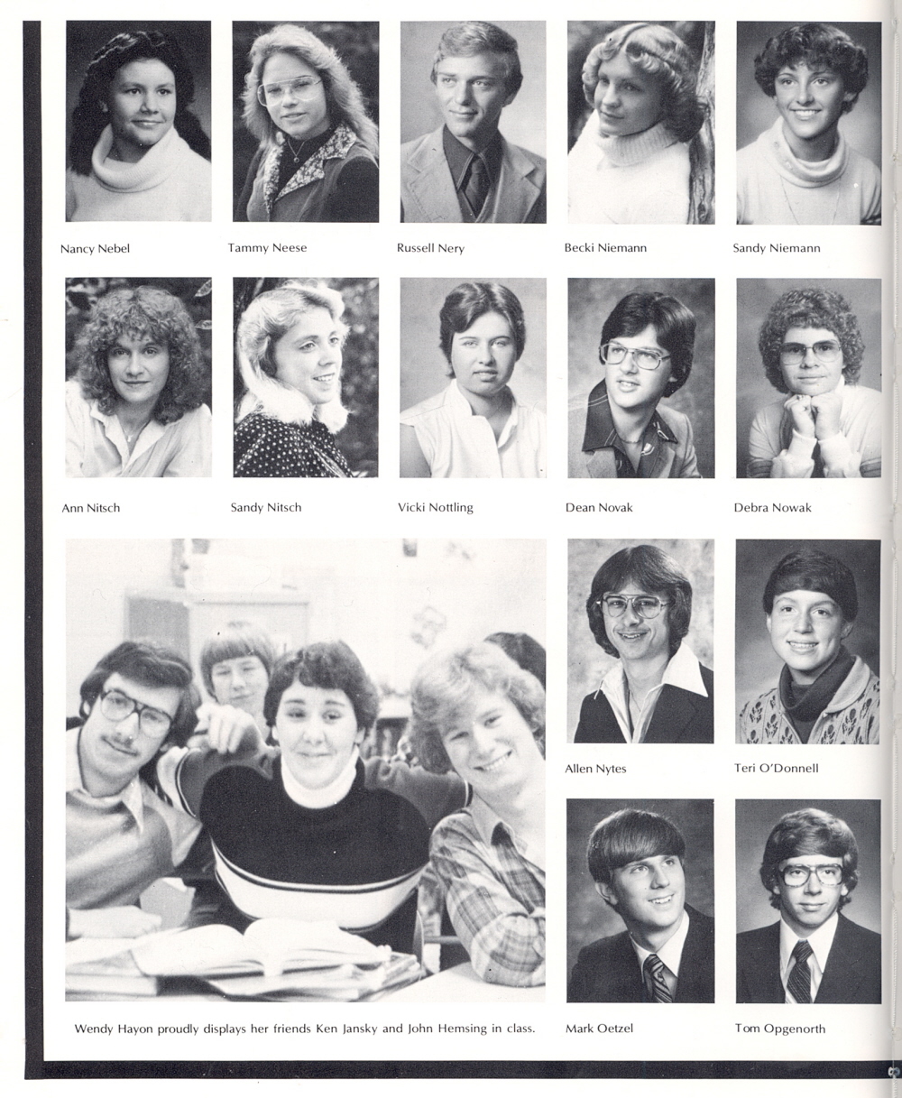 1980 Sheboygan South High School, Page 40: Nancy Nebel, Tammy Neese, Russell Nery, Becki Niemann, Sandy Niemann, Ann Nitsch, Sandy Nitsch, Vicki Nottling, Dean Novak, Debra Nowak, Allen Nytes, Teri O'Donnell, Mark Oetzel, Tom Opgenorth.