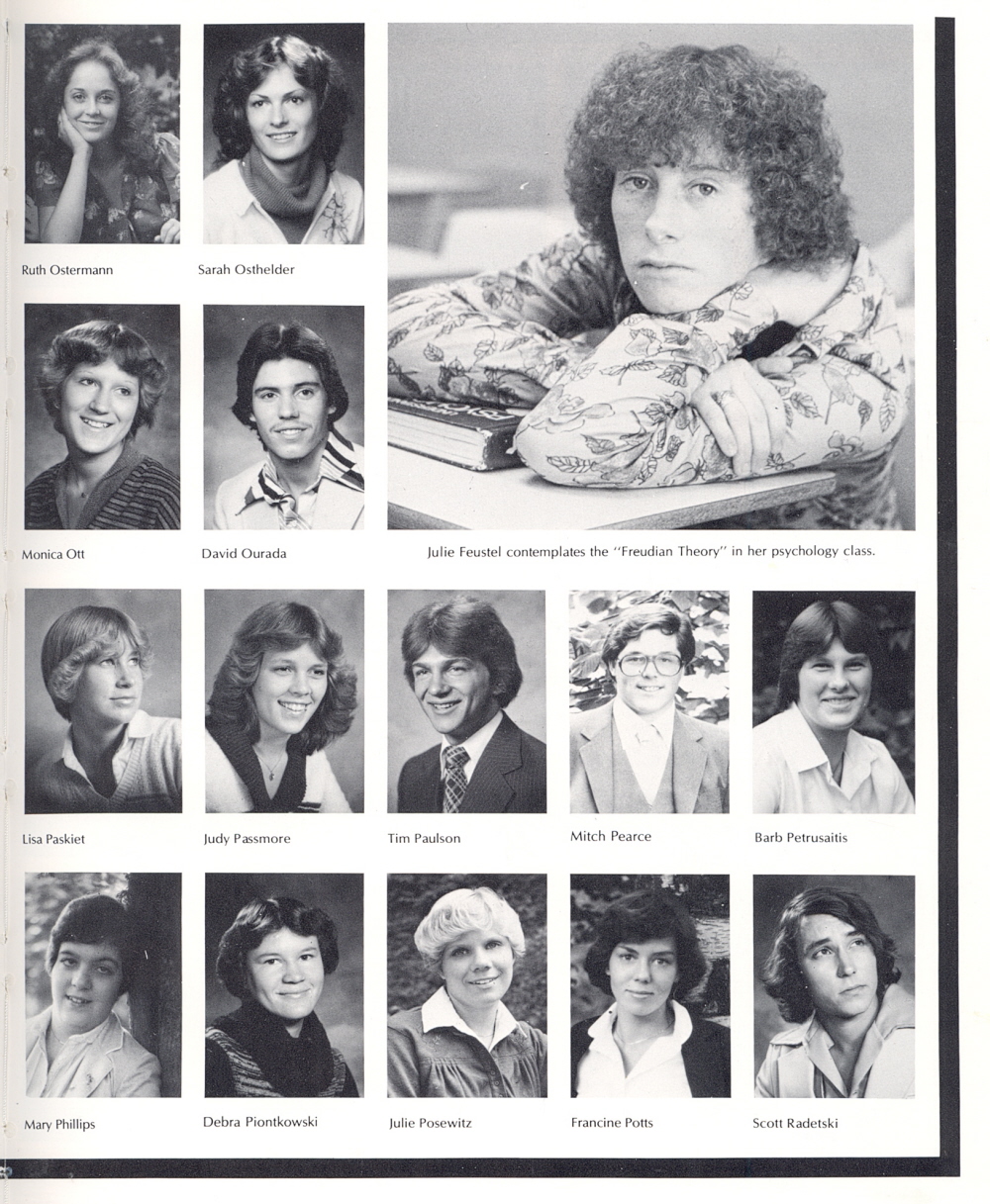 1980 Sheboygan South High School, Page 41: Ruth Ostermann, Sarah Osthelder, Monica Ott, David Ourada, Lisa Paskiet, Judy Passmore, Tim Paulson, Mitch Pearce, Barb Petrusaitis, Mary Phillips, Debra Piontkowski, Julie Posewitz, Francine Potts, Scott Radetski.