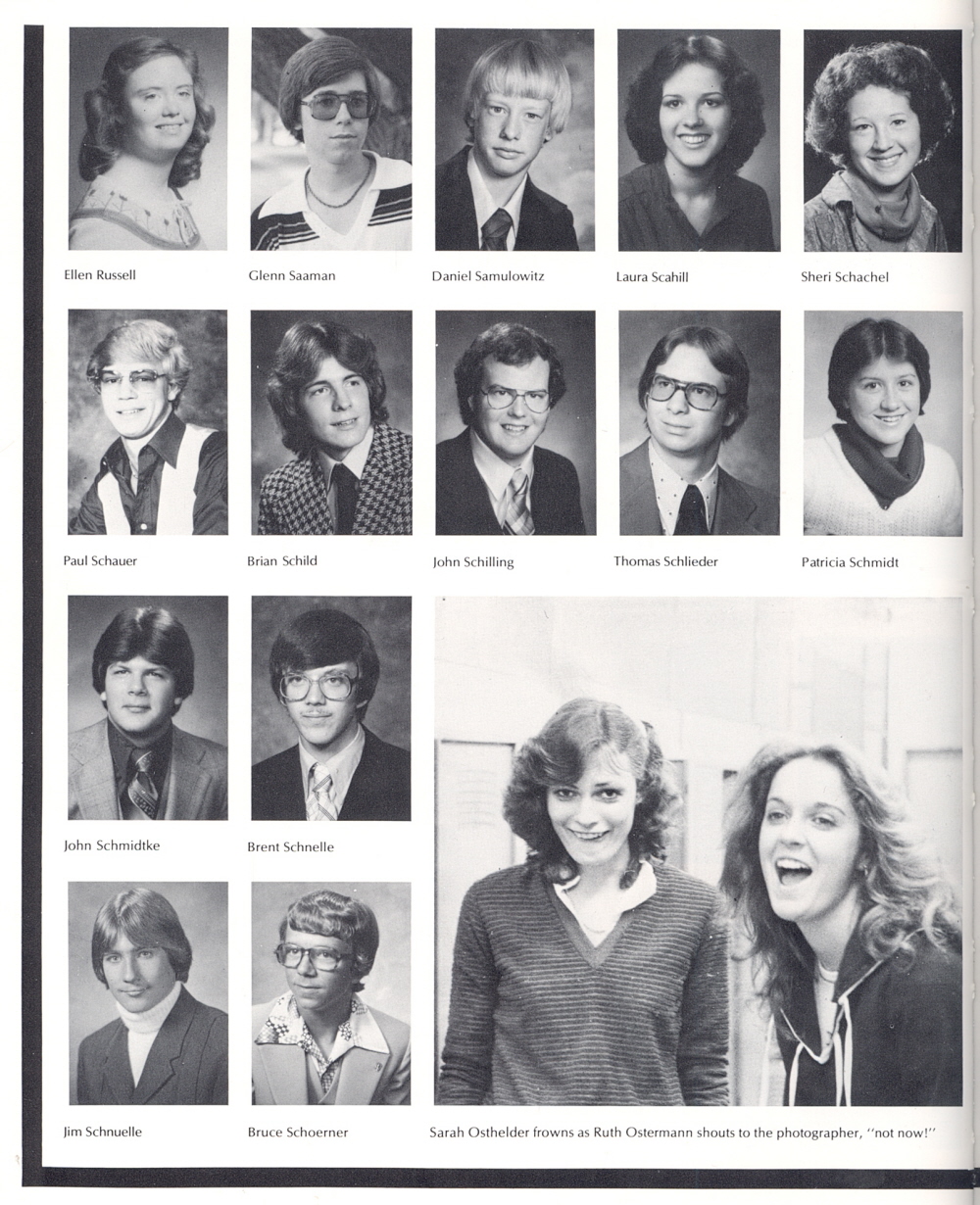 1980 Sheboygan South High School, Page 44: Ellen Russell, Glenn Saaman, Daniel Samulowitz, Laura Scahill, Sheri Schachel, Paul Schauer, Brian Schild, John Schilling, Thomas Schlieder, Patricia Schmidt, John Schmidtke, Brent Schnelle, Jim Schnuelle, Bruce Schoerner.